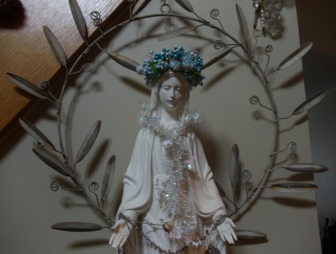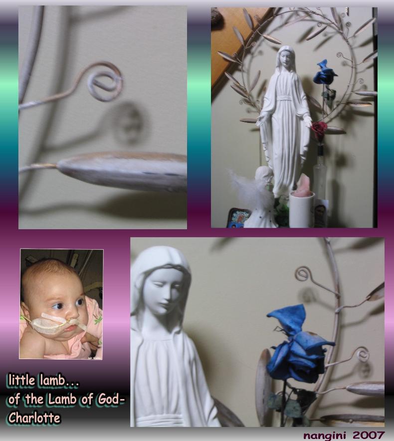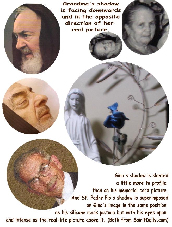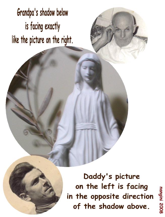 Charlotte’s Shadow Behind Mary’s Statue: reported on Spirit Daily (to see Mary with the Golden Shadows and with grey Family Shadows) The above is a collage of Charlotte, and her little shadow location, seen in the close-ups, behind the statue of Our Lady of the Immaculate Conception. And then there were more: over the next year, other shadows of deceased family members were also found as shadows behind this Statue of Mary: On October 13, 2006 while preparing to pray the Holy Rosary with Mother Angelica on EWTN and thinking, today, Charlotte, my baby granddaughter, would have been 6 months old had she lived. This day was also the day after my brother’s death. How very fitting for someone who had made rosaries to have died on October 12, the feast of Our Lady of the Pillar. My whole family was in mourning. My own little family was meeting at Charlotte’s tomb at Holy Cross Cemetery at 3pm so I had time to say the Rosary. As I was praying in front of the statue of Our Holy Mother with the nuns of the Angels’ Monastery just after 11:30 am, my eyes wondered to the side of the statue and rested on a little too familiar shadow on the wall. Charlotte! She was still fresh on my mind since June and here she was on the wall behind Our Lady. My mind couldn't register what I was seeing! Charlotte! My granddaughter's little baby face was on the wall behind Holy Mother. It looked like our favourite picture my son had sent to UCDs family magazine with the story, but in black and white. Charlotte Elizabeth Gentile had died four months earlier on June 14, 2006. She was born with a missing chromosome, needed to digest protein, creating the fatal Urea Cycle Disorder (UCD). She lived only 2 months. Her formidable character affected anyone who came in contact with her. She was born on April 13, Holy Thursday night and lived a normal baby life on Good Friday. Later I came to look at this as a gift from Charlotte for allowing me this one day to continue with The Way of the Cross play at St. Mary’s, my church here in Brampton. The next morning Holy Saturday, I had just finished the Congratulations Michael and Sabina and Welcome Charlotte posters and would be going to see my first baby granddaughter when the shattering phone call came from my son not to come because Charlotte was in a coma. Our family friend and Pastor of St. Wilfrid’s in Toronto, Fr. Massi Lombardi baptized Charlotte on Easter Sunday. And for two months her maternal grandparents and I visited daily with her parents until the day came when we were called in for our goodbyes. Two weeks before, on Pentecost, the little statue was given to me on behalf of St. Mary's Parish. It had been ordered before Christmas with the larger outdoor statue of the Immaculate Conception. Fr. Larry Marcille, the then Pastor, told me that Bishop Lacey had blessed the little white statue! It was well known that he himself had been healed with the waters of Lourdes. It had become a tradition at St. Mary’s that the children and youths would honour all Three Persons of the Holy Trinity, God the Father at Thanksgiving in thanksgiving, God the Son, with The Way of the Cross on Good Friday, a re-enactment of the Resurrection on Easter Sunday and, since our parish children would honour the Holy Spirit on Pentecost which happened to coincide with the visit by our Regional Bishop John Boissonneau, the little 2-foot statue would be presented to me then. This was June 4, and on June 14, 2006, Charlotte would be in Heaven. Four months later, Charlotte came for a visit to earth, and stayed as a shadow imprint behind the statue of Our Holy Mother. I was saying the Holy Rosary in front of this little white statue when my eyes wondered to the right and there on the wall was a perfect shadow of baby Charlotte! Charlotte? How could this be? What a surprise! What silence with such profound joy. I stood with my rosary in hand and just looked. I didn’t tell anyone at first, not even her parents that day at the mausoleum, because I didn’t know what to make of it, or how to explain it. When I eventually recovered from the unexpected encounter, and resigned to her presence, there, on the wall, I took pictures of the little shadow but nothing showed up on the camera. I knew it! It was not real or it could not be photographed. But within 2 weeks my youngest, Robert passed by, saw it and believed: Oh yeah! That's Charlotte! Her parents could see her as did the few who came to visit. Then one day, in conversation I mentioned that I was disappointed in my new camera because the flash blanched the true colour of flowers in close-up photos. My niece Laura suggested I remove the flash. I didn’t know there was this option. On the way home, I thought…Charlotte’s shadow! She had been on my wall for months. If I found how to remove the flash, I might be able to take a picture of the Charlotte Shadow! My daughter showed me and in March 2007, there was Charlotte’s shadow in the picture!!! Reviewing how this little baby shadow came to be on the wall, at that exact spot and all the conditions and events that took place for this to happen was a feat in logistics that occurs only in God-incidences. If this were a movie, pressing fast forward would create this map of my movements: 1. Finding a place for Mary: For the first four months, I tried to find the right place for Mary’s statue. I tried different set-ups. A side table was too low. Then I found the perfect wooden pedestal at the front door, brought it into the foyer, fitting well under the semi-circular stairway and placed Mary on it. It really was perfect. 2. Finding the ornate wreath: At the end of September I went to the Church Bazaar sponsored by the Catholic Women’s League, and brought home a creamy beige wrought iron circle decorated with leaves and swirls. I loved it but didn’t know what it was for so I thought I might just put it on the wall. I held up the circular ornament and placed it in front of me to see where 