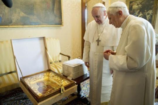 | After the Saturday night Mass on February 9th, and as I was leaving by the Office exit, a woman coming across the driveway from a side exit, excitedly approached me as I passed and asked if I had seen Mary's Statue and I followed her gaze and there in the shadowy corner of the Church was Mary's white marble statue wearing a brand new snow crown. Our laughter of delight drew others to look as they passed and then I too continued to go home. But in my mind, I knew Mary would want me to take a picture of Her new crown of snow -following the contours of the statue so precisely, so I turned around and took the 6 pictures. The time was about 6:15pm. After taking the first 3 pictures, our Pastor, Fr. Liborio Amaral came out to bless a car waiting in the driveway. It was this car that had its headlights shining on the statue so I could take these pictures. (This is the same Mother Mary as the Medjugorje Mary. See: http://www.medjugorjetoday.tv/8942/mirjana-pleaded-prayers-for-the-pope/) The next day, Sunday the 10th of February, I was sharing the photo of Mary's Snow Crown and I noticed a cross shape on the dress of Our Lady in the 4th and 5th pictures. There was no cross on the statue being lit up by the car's headlights the night before because if it had been there, the people leaving after Mass would have flocked to the little life-sized statue to look a little closer and a lot longer. Even before the Pope's announcement reached us on the 11th, nature was silently dressing God's Perfect Creation with a perfect dome! (This is in reference to this article: **Why was his resignation made on Feast Day of Lourdes?) After I saw the picture of the lightning bolt striking St. Peter's dome, I was sharing the pictures again on the 12th, and I automatically described Mary's new crown as Mary's Snow Dome -St. Peter! the lightning bolt! the Pope! a priest and the cross, and a little white marble statue of Mother Mary with a Snow-Dome Crown at St. Mary's Church in Brampton whose Marian statues and namesake is the Immaculate Conception celebrated on Dec. 8, after Our Lady of Lourdes!! It was then that I also realized that the cross appears on Mary's dress after Fr. Liborio came out to bless the car with holy water while intoning with his megaphone voice the Our Father into the silent night: every anointed priest belongs to Jesus under the sign of the Cross, whether he performs a simple priestly duty like blessing a car or sitting on the Chair of Peter! Jesus is in charge. This is His Church; this is His Pontiff just as, this is His priest. And His Mother Mary is the Mother of the Church and in a very special way she is the Mother of every priest Jesus chooses and calls to service as servant of the Eucharist -the Living Jesus, the Perfect Sacrifice, the Divine Presence among us. The voice of Truth and Love is always One. There is no division or contradiction in decisions, intentions or actions, our beloved Pope Benedict tells us (Ash Wednesday Mass). And in these pictures worth a thousand words, Our Holy Mother reassures us that the decision of the Head of the Church on earth is in union with the Holy Will of God. And Mary's new crown? Well, it looks like a perfectly sculpted snow-dome, lending to the lightning, God's seal of approval that struck St. Peter's Dome and lit the night sky! |